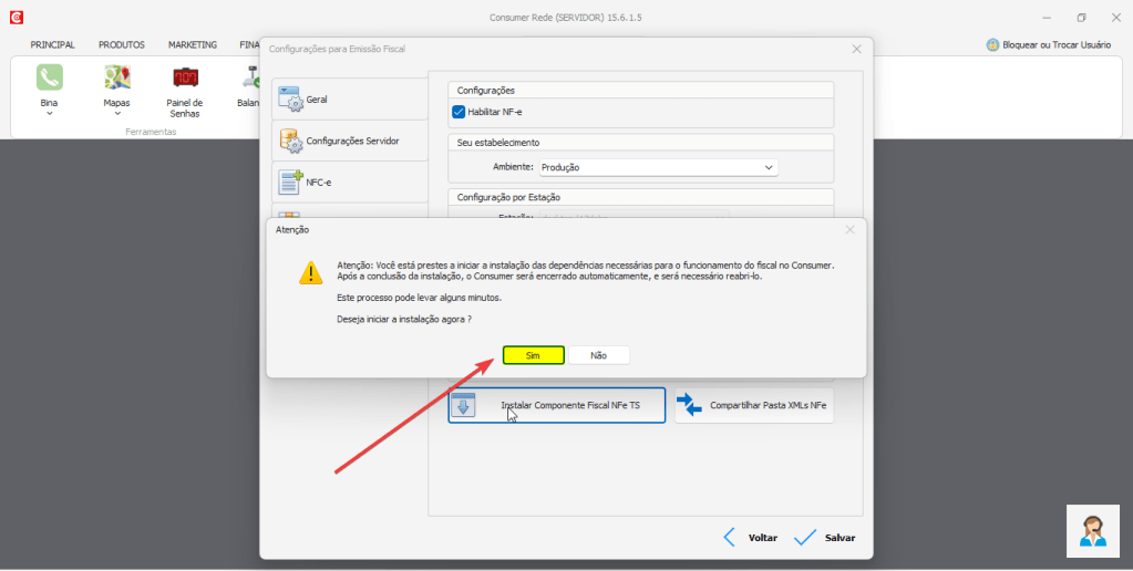 Clique em Habilitar NF-e, selecione o Ambiente Produção e clique em “Instalar Componente Fiscal NFe TS”: