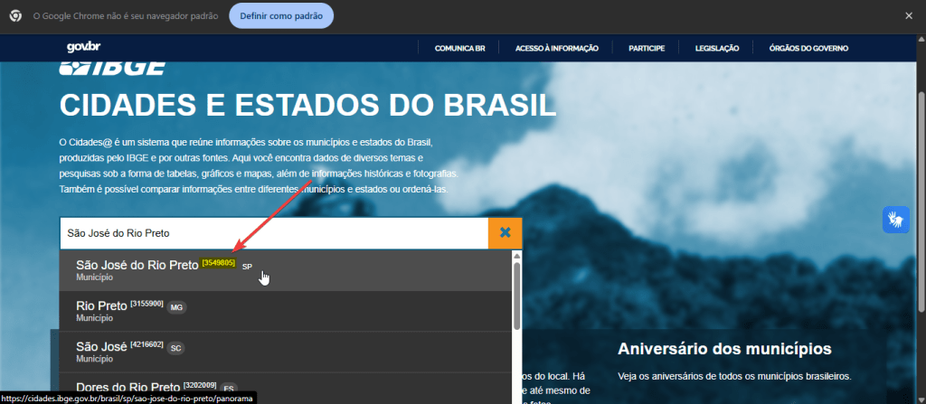 Para buscar o código da cidade, clique aqui, ao selecionar a cidade, o código correspondente aparecerá ao lado.