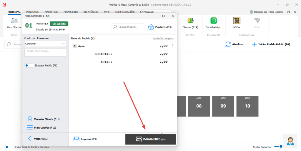 Ao finalizar o processo, faça um pedido e lance um produto com os dados fiscais já preenchidos para testar a emissão do cupom fiscal, como fizemos abaixo com a água: