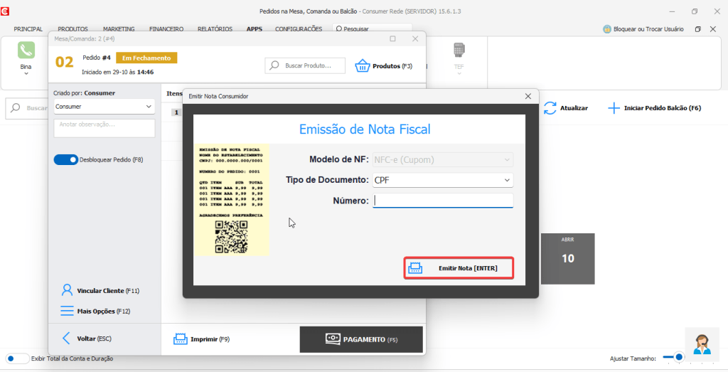Se no cadastro do cliente estiver preenchido o campo CPF, e este cadastro atribuído ao pedido, o Programa reconhecerá a informação e já trará o campo de documento de emissão configurado, isso também ocorrerá com os pedidos do MenuDino e iFood, quando o cliente inserir o CPF nos devidos campos.