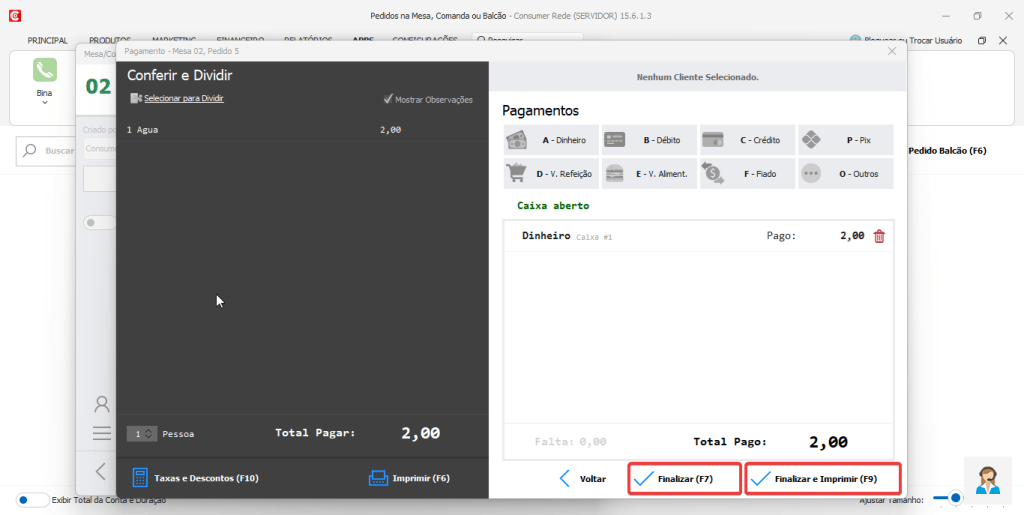 Escolha a forma de pagamento e clique em Finalizar (F7) ou Finalizar e Imprimir (F9):