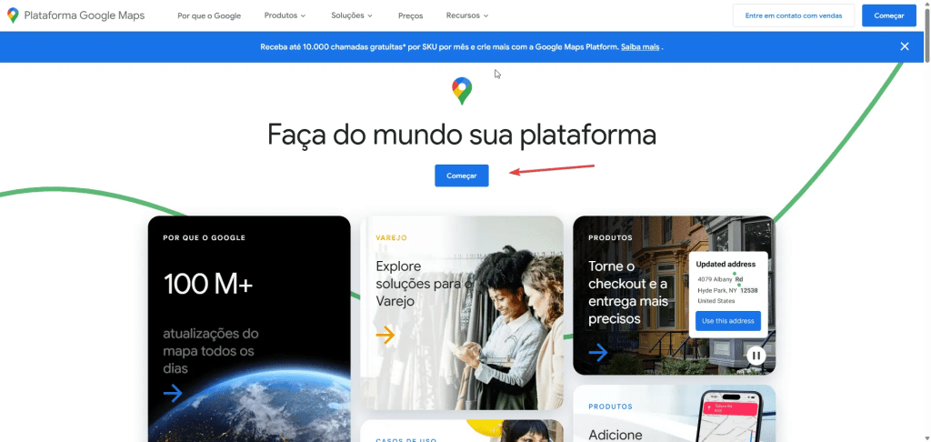 Acesse Google Maps Platform e clique em Primeiros Passos ou Começar. Caso solicitado, faça login na sua conta Google.