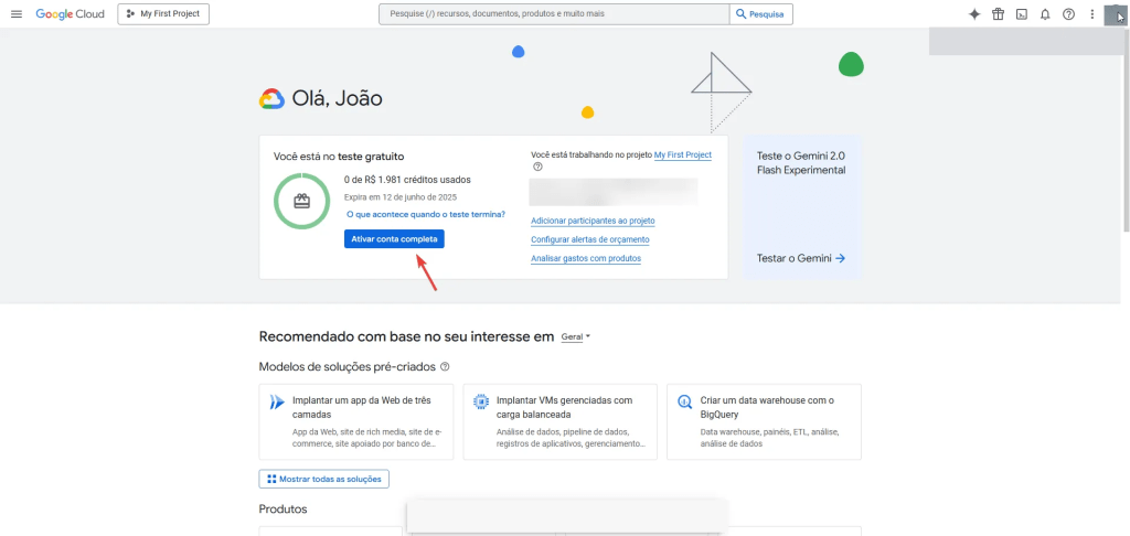 Para ativar o crédito de $300 dólares (válido por até 90 dias ou até o uso total), clique na opção conforme a imagem abaixo: