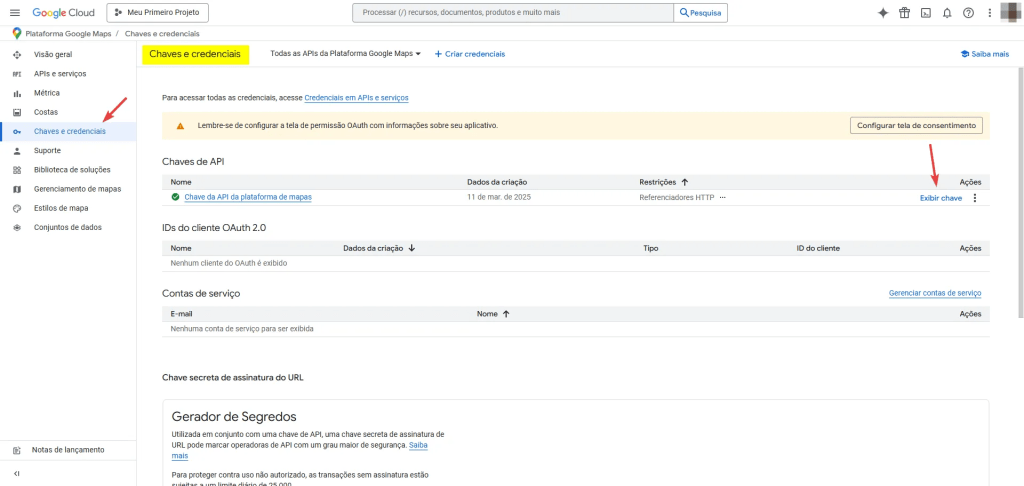 Também é possível visualizar novamente sua Chave de Maps acessando conforme a imagem: