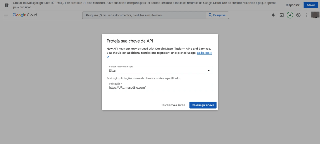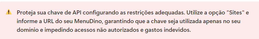 Este manual é exclusivo para criação da chave mapas para o MenuDino com restrições para evitar uso indevido de outros sites. Caso precise realizar a criação da chave de mapas para o Consumer onde não há necessidade de restringir sua chave de mapa clique aqui.