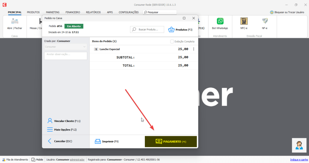 Após lançar os produtos, clique no botão Pagamento (F5)