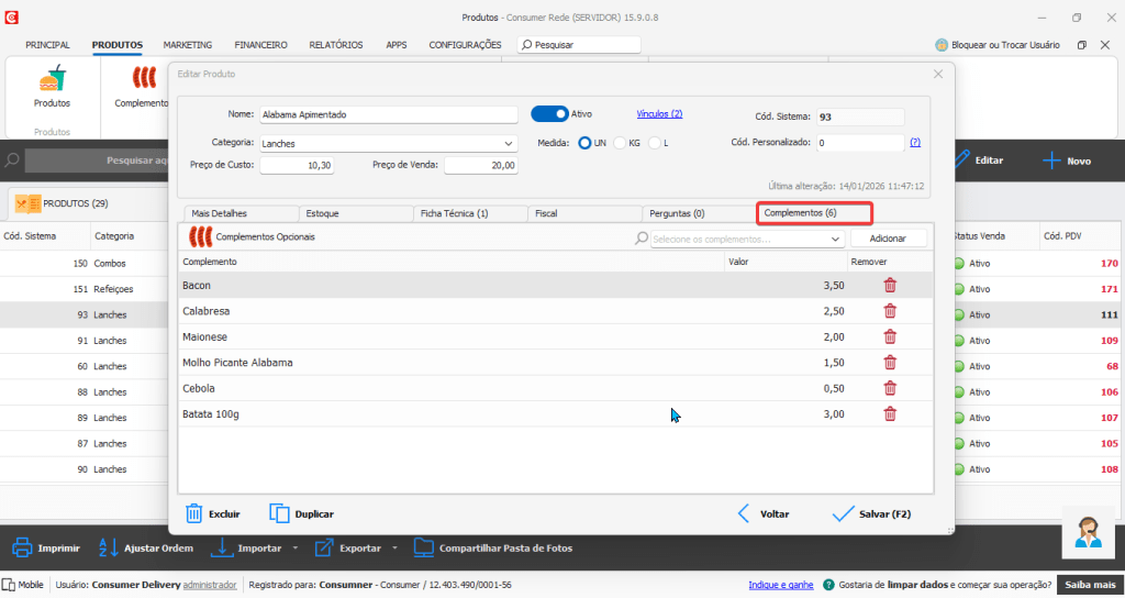 Na aba Complementos, você vincula os itens adicionais que podem ser incluídos no produto. Clique aqui para ver como cadastrar complementos.