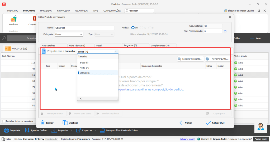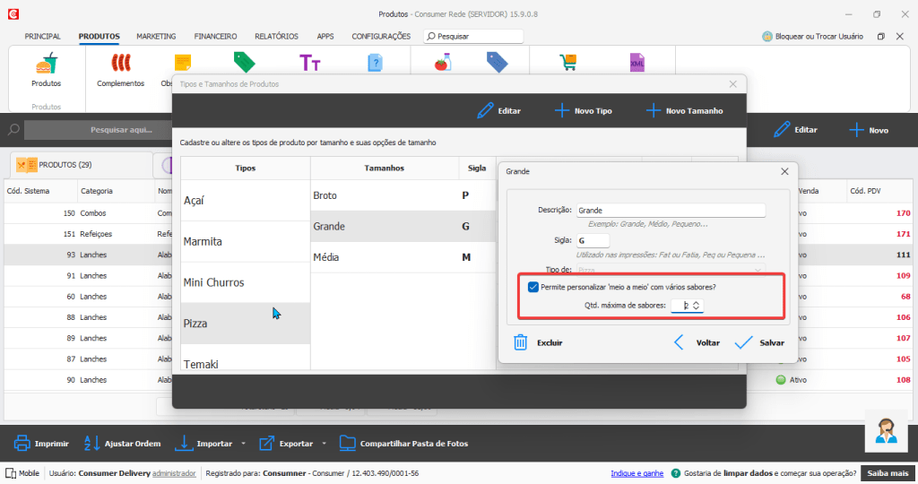 O Consumer também permite cadastrar produtos com diferentes tamanhos, ideal para itens como pizzas, açaís e milk-shakes.