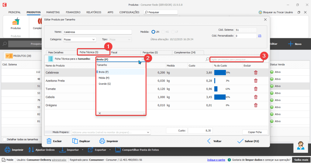 Nessa etapa, você vincula os ingredientes do produto e, a cada venda, o Consumer abate automaticamente do estoque as quantidades definidas. Além disso, o sistema mostra quais insumos têm maior impacto no custo do produto.
