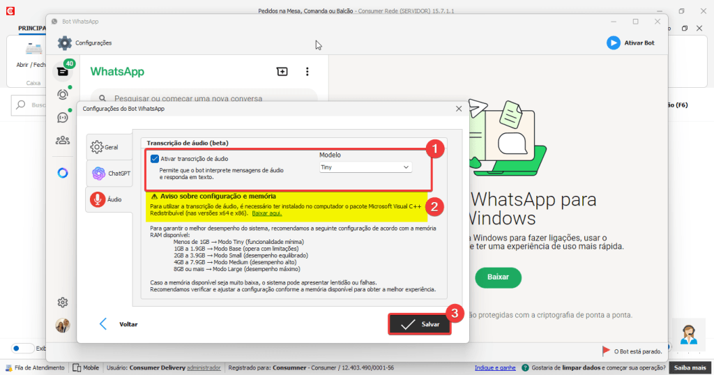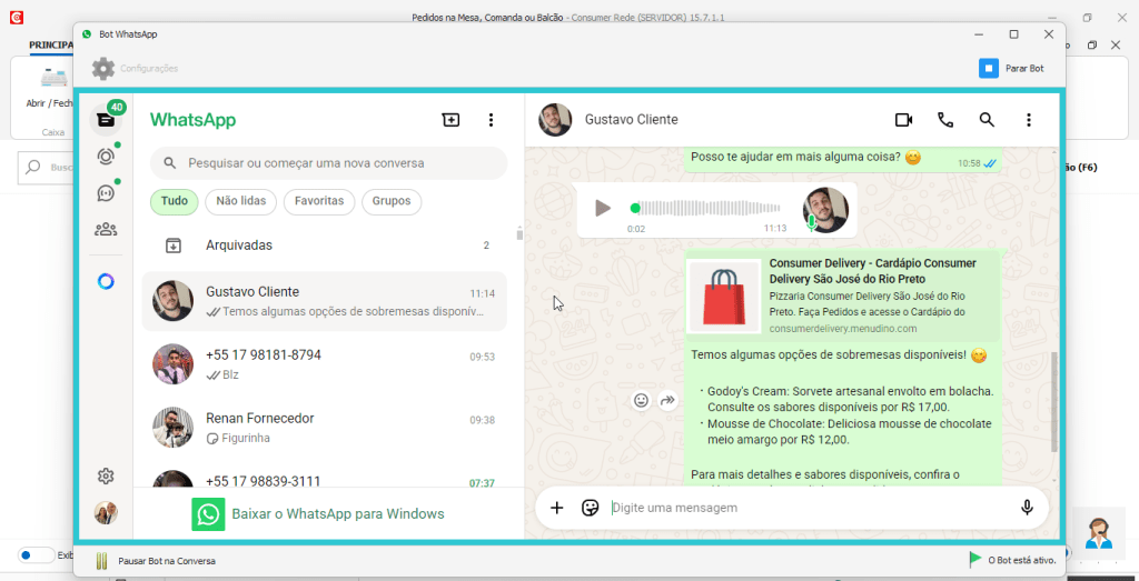 É importante ressaltar que ao reinicializar o Consumer a integração com o WhatsApp permanecerá dentro do programa, mas sempre que reinicializado será preciso ir até a aba de Apps, abrir o Bot e ativa-lo para que a inteligência artificial entre em ação: