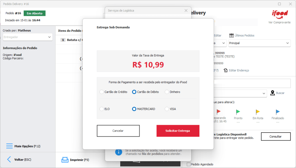 Essa funcionalidade amplia as opções de entrega do restaurante, centralizando a operação logística em um único fluxo.