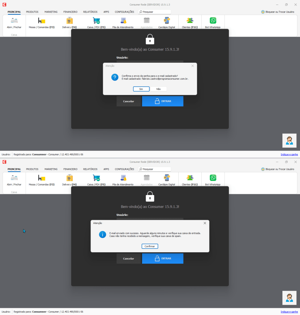 Ao instalar o Programa Consumer em seu computador, logo no primeiro acesso, será criado um usuário administrador com acesso total ao sistema. Nesse momento você vai definir um usuário e uma senha de acesso. Caso esqueça sua senha de acesso ao programa, basta clicar na opção Esqueci minha senha, como mostrado na imagem abaixo: